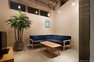 心を落ち着かせる効果があるといわれる「紺色」の布張りソファをL字型に設置し、ローテーブルを置いています。こうすることでお互いに真正面に向き合うのではなく、45度の角度で斜めに相対することができ、圧迫感なく話せるのだそうです。同じく尾林先生のアドバイスをもとに、大きな観葉植物を設置して、話しながら視線を逃がしやすいようにしました。